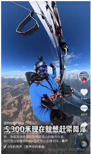 这段丽江玉龙雪山到香格里拉哈巴雪山飞行距离近60公里,来回耗时3个多钟头的滑翔,被红阳剪辑成一条10分钟左右的短视频发布到了抖音。视频发布后立马获得了近230万的播放量,3万余人为他的专业与勇气点赞。