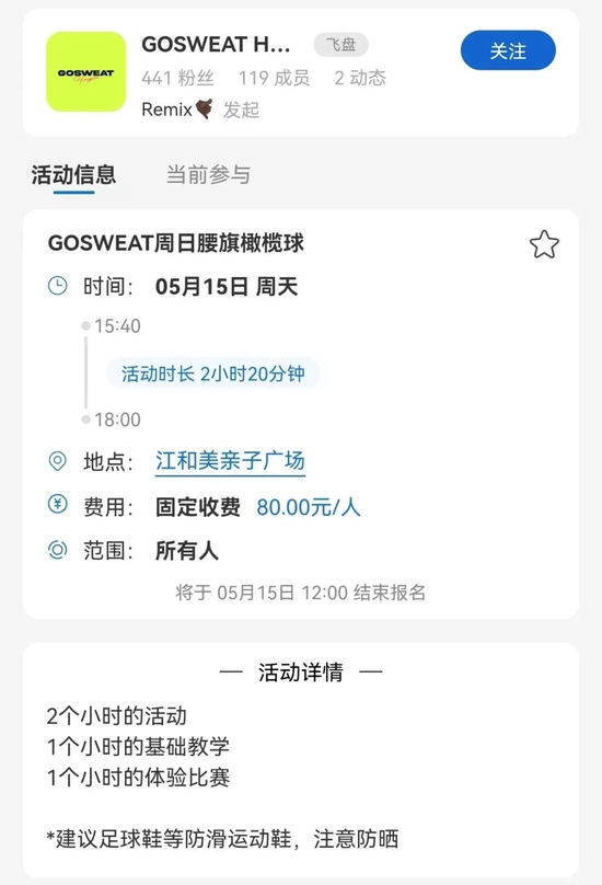 不少腰旗橄榄球俱乐部的活动详情显示,一次体验活动,至少包含讲解、基础训练、对抗比赛三个阶段,不同的活动专场,还有更为针对性的训练内容。总体来说,只要花上七八十元,找到腰旗橄榄球社群,在两三小时内,一个腰旗橄榄球小白就能完成从学习到参赛的全过程。