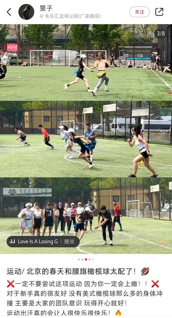 有关腰旗橄榄球的社群组织、规则介绍、活动宣传、体验感受全方位挑动着人们出门去浪的简单愿望,而其低门槛、入门快、有趣且有爱的属性也成功让已经躺平的年轻人走向训练场。