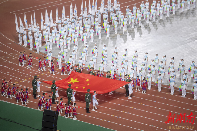 20时,在铿锵有力的《运动员进行曲》中,本届省运会的裁判员、运动员代表方阵步入运动场。入场式后,全场起立,高唱中华人民共和国国歌。在雄壮的国歌声中,五星红旗冉冉升起,迎风飘扬。伴随着湖南省第十四届运动会会歌的旋律,会场上升起了湖南省运动会会旗、湖南省第十四届运动会会旗。