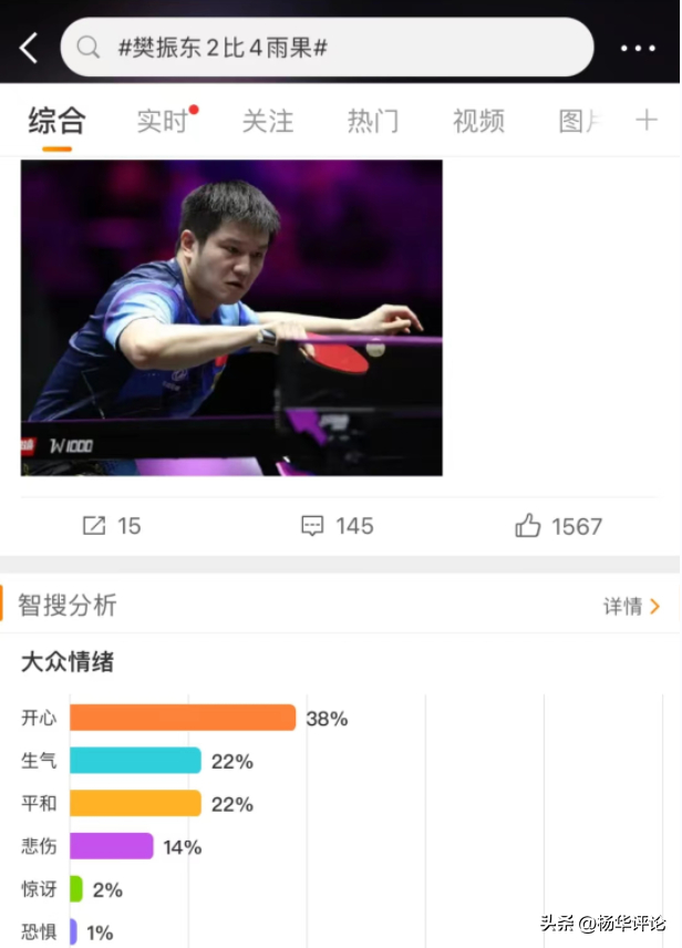 2024年WTT仁川冠军男单半决赛樊振东2-4不敌巴西选手雨果-卡尔德拉诺,赛后某社交媒体大众情绪排名第一的竟然是“开心”,不少网友开始吐槽小胖不该输给外协会选手,但并不是善意的批评建议,而是各种讽刺奚落,还有一种落井下石的快感。