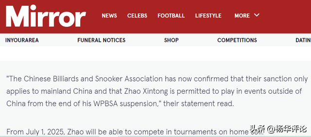 在赵心童赢得斯诺克世锦赛冠军之后,中国台球协会首次发表官方声明,不是在台协官网,而是在英国《镜报》。中国台协解释了对赵心童的额外禁赛仅在中国大陆有效,而他参加世锦赛是符合规定的,也是中国台协同意的。