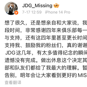 想了很久,还是想亲自和大家说,我决定暂时休息一段时间,非常感谢四年来俱乐部每一个人对我的信任与支持,还有这四年里甚至更长时间里一直相信我、支持我、鼓励我的粉丝们,真的谢谢你们!想起在JDG这几年,有太多值得纪念的瞬间,也有一些事情遗憾没有完成。做出休息这个决定其实很难,但俱乐部和队友们都给了我最大的理解。暂时的休息并不是告别,明年会让大家看到更好的MISSING!