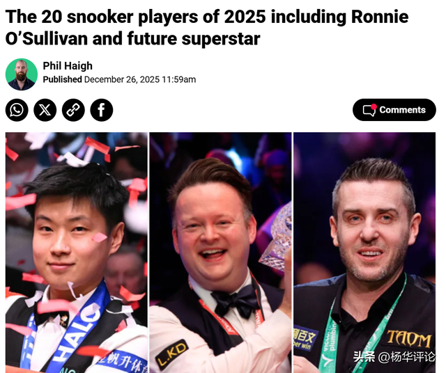 英媒评出2025年斯诺克20强:赵心童非第一,吴宜泽第九丁俊晖落榜