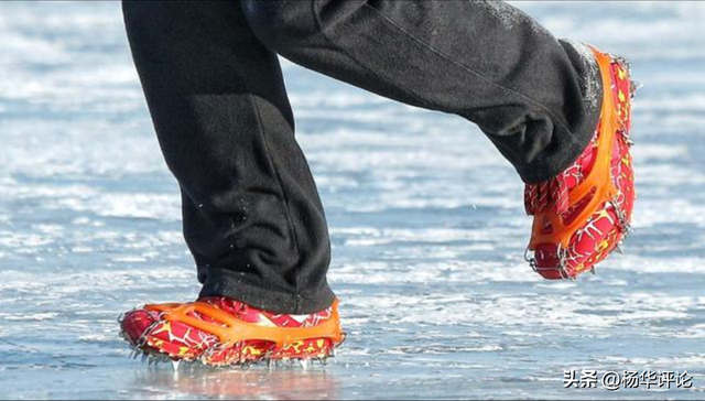 脚下的跑鞋套着一副“冰爪”,爪尖深深嵌入积雪,足够的抓地力确保每一步都踩得稳当。冰爪由钢钉和防滑齿组成,通过绑带固定在鞋外。在冰面上行走或跑步时,这些钢钉能牢牢抓住冰面,防止滑倒。