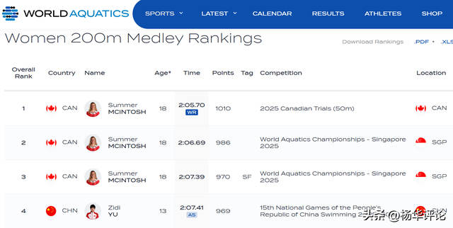 作为中国女队的中坚力量,李冰洁延续了一贯的稳健表现,成为本次排名中入围前十项目最多的中国选手。她在女子200米自由泳以1分54秒52位列第三,400米自由泳游出3分58秒21的亚洲纪录并排名第五,1500米自由泳也以15分43秒94跻身第九,彰显了其在中长距离自由泳领域的顶尖水准。