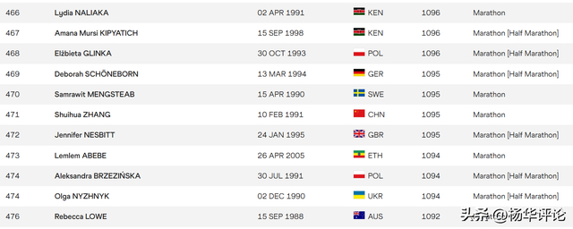 这一波动延续了近期的下滑趋势,上周她的排名尚停留在第461位,而医院处分公布时其排名曾一度处于第423位。处分之后,她连续多周没有参赛,2026年元旦东极马拉松回归,但因该赛事并非田联标牌赛事,且极寒条件成绩一般,所以排名不可避免掉落。