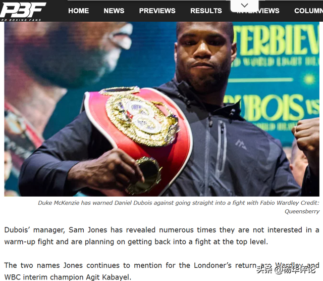 但杜布瓦的经纪人萨姆·琼斯完全否定热身赛构想。他多次公开表态,团队对调整状态性质的赛事毫无兴趣,计划让杜布瓦直接重返最高级别赛场。这种强硬态度背后,是明确的目标指向——新任WBO拳王法比奥·沃德利与WBC过渡拳王卡巴耶尔,两人成为唯一被提及的潜在对手。