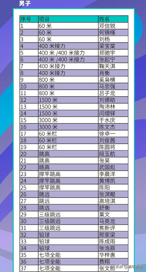 2月2日下午,中国田径队官宣天津室内亚锦赛72人名单,男运动员37人女运动员35人。室内亚锦赛2月6到8日在团泊体育中心开赛 。短跑小孩姐陈妤颉、跨栏人气明星吴艳妮缺席,而男子60米邓信锐死磕日本名将桐生祥秀。
