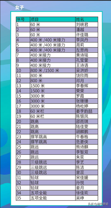 中国田径队室内亚锦赛名单:陈妤颉吴艳妮缺席,邓信锐刘峡君领衔
