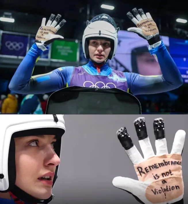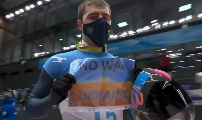 在冬奥会无舵雪橇比赛中,乌克兰女选手奥琳娜-斯玛哈对同胞的举动予以声援,她对镜头展示着自己的手套,上写: