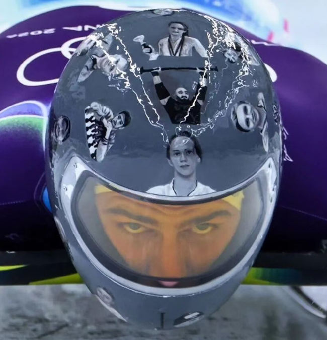 他在社交媒体上介绍自己将在冬奥会比赛中佩戴的头盔,引发了极大关注,在这顶头盔上,印满了一张张黑白照片……