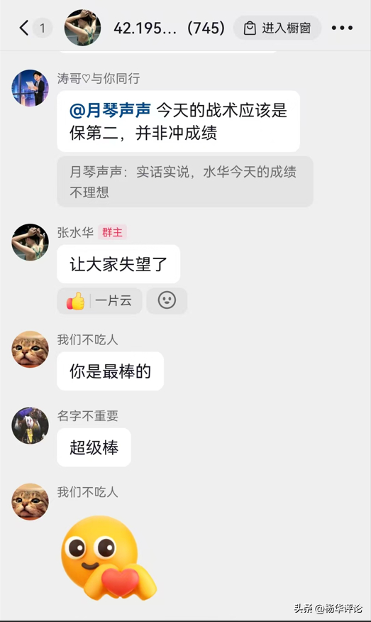 冲线后的张水华面带笑容,但难掩内心失落,第一时间在内部粉丝群里发声“让大家失望了”,字里行间满是自责,真诚地向一路支持她的粉丝致歉。这份主动道歉的态度,足以看出她对自己有着极高的要求,即便外界并未过多苛责,她依旧因没能拿出理想状态而心怀愧疚。