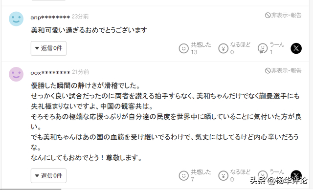 “你们那种极端的应援方式,其实是在把自身的素质暴露给全世界看,这点最好早点意识到。不过美和身上流着那个国家的血脉,表面虽然坚强,内心肯定不好受吧。无论如何,恭喜你!我很尊敬你。”该网友补充道。
