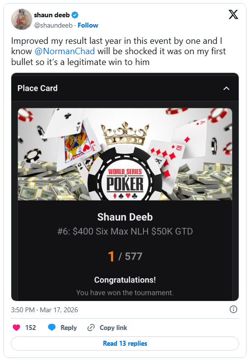 Deeb在扑克界声名显赫,凭借卓越牌技、冷静头脑和顽强斗志,在众多顶级赛事中成绩优异。他不断挑战自我、突破极限,积累了丰富经验与深厚战术素养。此次WSOPC夺冠,是对他长期努力的肯定,也是其生涯重要里程碑。
