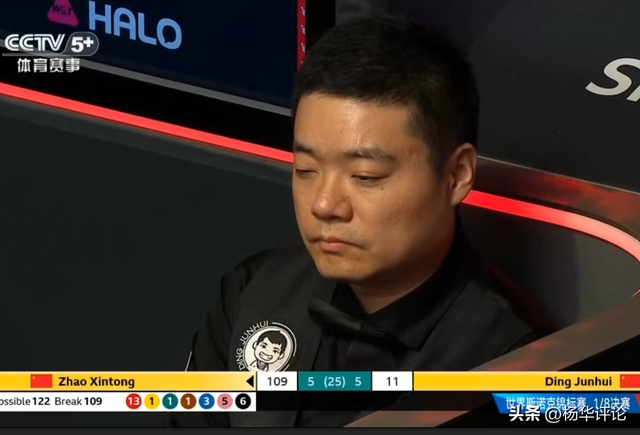 第11局,赵心童架杆姿势标准漂亮,轻轻薄切一颗红球打入中袋,就此开启一杆115分的连续得分。最后他本可清台收官,却在一颗难度不大的黑球上失手,事后还略带自嘲地淡然一笑,6-5处于主动。此时,电视特写显示丁俊晖右眼不受控制的跳,这当然不是好的信号。