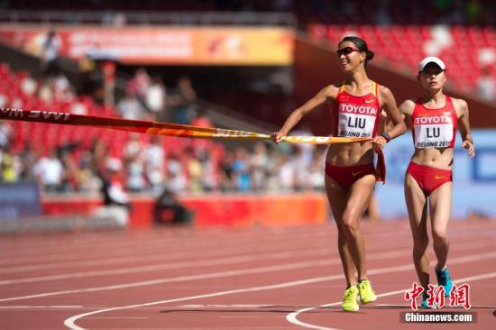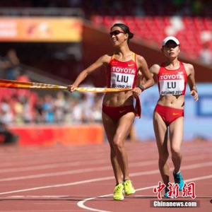 8月28日,2015年北京田径世锦赛进入第七比赛日,在女子20公里竞走决赛中,中国选手刘虹(右)以1小时27分45秒摘得金牌,这也是中国田径队在本次世锦赛上收获的首枚金牌。她的队友吕秀芝(左)获得银牌。中新社发 富田 摄