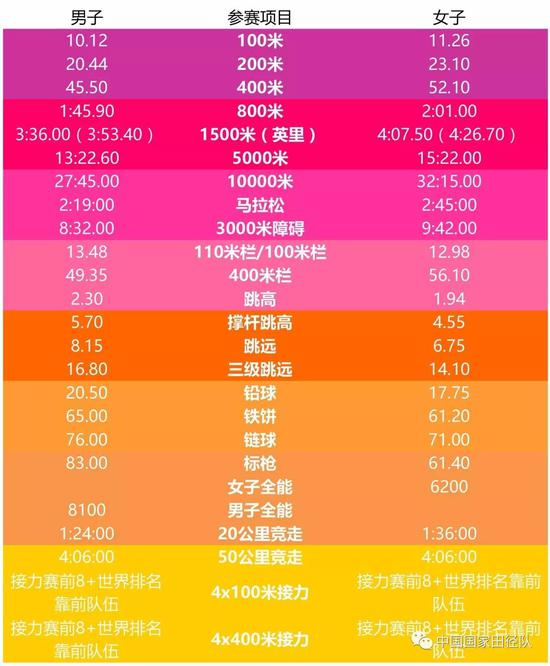 4、 如果在达标时间内,该项目没有达到理想参赛人数,会根据世界排名遴选运动员参赛。但不包括10000m、马拉松和竞走项目。
