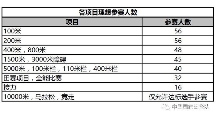 国际田联为每一个项目预设了参赛人数,世锦赛将按照这一人数来确定最终的比赛规模。比如男子100米预设56人参赛,如果有56人达标,就按照这56人名单参赛;如果少于56人达标, 则通过其他方式递补到56人参赛。