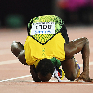 2017年8月5日,英国伦敦,2017世界田径锦标赛男子100米决赛后,博尔特跪地亲吻赛道。
