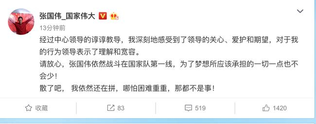 今天晚上,随着这份处罚决定的扩散,张国伟在微博正式发文回应,表示:“经过中心领导的谆谆教导,我深刻地感受到了领导的关心、爱护和期望,对于我的行为领导表示了理解和宽容。请放心,张国伟依然战斗在国家队第一线,为了梦想所应该承担的一切一点也不会少!散了吧, 我依然还在拼,哪怕困难重重,那都不是事!”