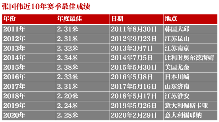 今年1月底至2月底,一直在国外集训的张国伟先后参加了6站赛事,其中4次跳过2.25米,最好成绩为2月29日的2.28米,距离东京奥运会的达标线2.33米还差5厘米。返回国内后不久,张国伟“决定退役”。