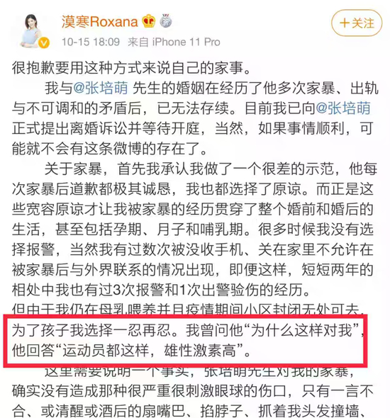 10月15日晚,短跑健将张培萌的妻子张漠寒发布了一条长微博,控诉了张培萌对自己实施家庭暴力等行为。微博发出后迅速得到了网友的广泛关注。其中,张漠寒讲道,当追问张培萌为什么这样对自己(家暴)时,张培萌给出的解释是“运动员,雄性激素高”。这一“理由”,也成为了许多人讨论的话题。