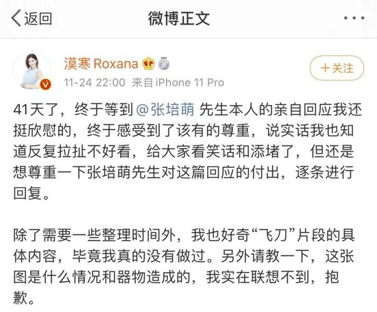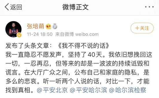 11月24日晚,张培萌在自己的微博发表长文,首次对妻子爆出的家丑进行正面回应。