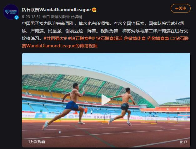 标注为“钻石联赛WandaDiamondLeague”的官方微博,今日发帖称:中国男子接力队迎来新面孔,棒次也有所调整。本次全国锦标赛,国家队将尝试苏炳添、严海滨、汤星强、谢震业这一阵容。