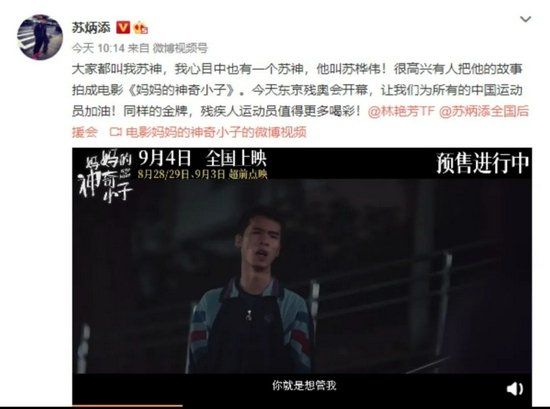 日前,以苏桦伟为原型拍摄的电影《妈妈的神奇小子》宣布定档于9月4日上映,苏炳添除了是为“苏神”以及电影打气,也是为8月24日开幕的第16届夏季残疾人奥林匹克运动会助威。