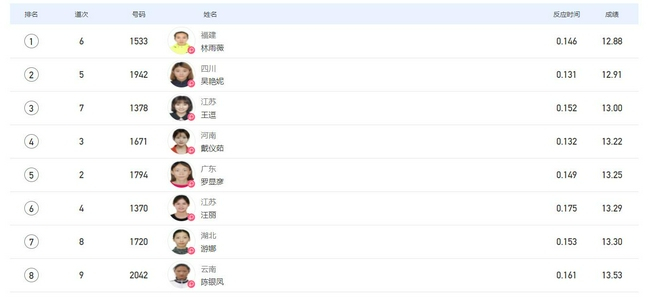 最后冲线,林雨薇12秒88夺冠!正好和刘翔的男子110米栏前世界纪录一样。吴艳妮亚军,王逗第三名。