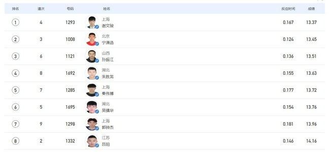 宁潇函的发挥是很大亮点,他紧紧咬住了谢文骏,最终突破13秒50大关,以13秒45的个人最好成绩拿到了亚军。孙振江第三。