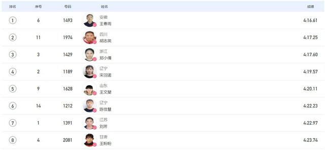北京时间9月24日晚,在西安奥体中心进行的第十四届全运会田径比赛,结束了女子1500米决赛,安徽选手王春雨4分16秒61获得冠军,四川选手胡志英4分17秒25亚军,浙江选手邓晓倩4分17秒60第三。