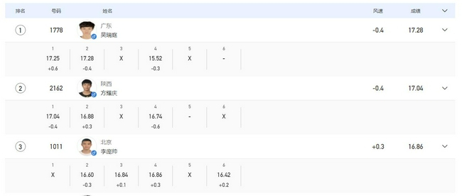 第二跳吴瑞庭再次突破到17米28!这两个绝对优势成绩,确保了夺冠。方耀庆第二跳16米88,就此再无突破,但17米04足以摘银。