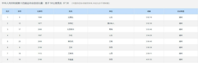北京时间9月25日上午,在西安进行的第十四届全运会田径大项男子50公里竞走比赛,在雨中结束奋战,最终山东选手边通达3小时52分16秒获得冠军,重庆选手贺相红3小时52分30秒获得亚军,青海选手扎西杨本3小时53分48秒列第三。三人都是首次进入全运会前三。