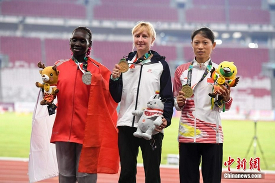 资料图:2018年8月25日,雅加达亚运会田径女子10000米决赛结束。中国选手张德顺以32分12秒78的成绩获得季军,并打破了个人最好成绩。图为张德顺登上领奖台。中新社记者 杨华峰 摄