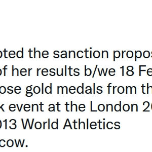 然而,这些排名此后不断发生变化。在伦敦奥运会田径女子20公里竞走比赛中获得第2名的卡尼斯金娜以及第5名的基尔佳普金娜,分别于2015年和2019年被查出兴奋剂违规,因此被取消了伦敦奥运会的比赛成绩。