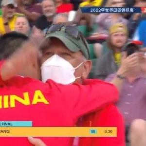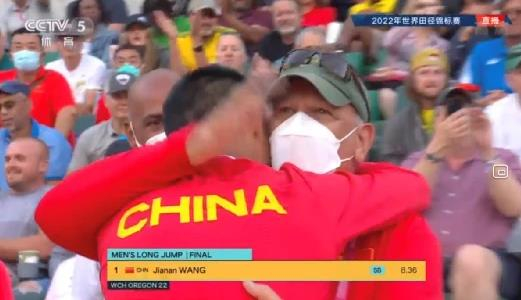 田径世锦赛,王嘉男一跳惊人创造历史,以8米36的成绩拿下中国首枚男子跳远金牌。夺冠后他跑到场边,流着泪与美国外教兰迪-亨廷顿紧紧拥抱,感谢他的指导。
