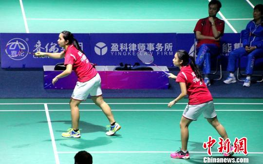 图为10月25日,中国首届青运会羽毛球女双四分之一决赛中,香港组合吴芷柔/杨雅婷以2:0战胜了来自广州的对手冯雪颖/韩雪萱,成功晋级四强。 闫旭 摄