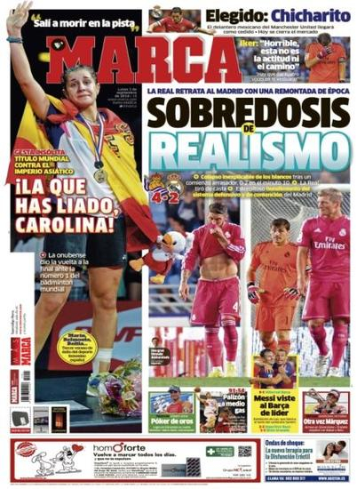 赛后,头版常年被皇马[微博]、巴萨[微博]以及西班牙男篮占据的《马卡报》上,刊登了身披国旗的马林喜极而泣的摸样;来到香港,马林介绍:“羽毛球在我们国家越来越受欢迎,现在到了半决赛、决赛阶段,西班牙电视台会直播羽毛球赛事,更多同胞可以看得到我打球,这在以前是没有过的。”