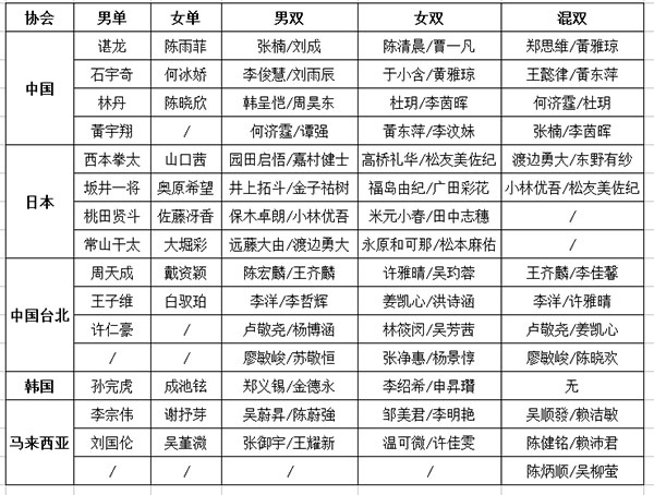 男单:安赛龙、李宗伟、石宇奇、孙完虎、斯里坎特、桃田贤斗、周天成、谌龙