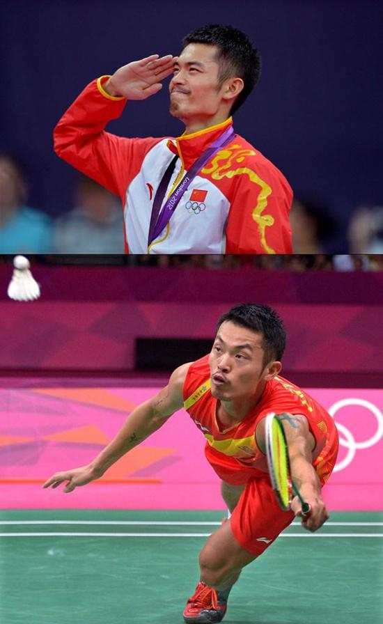 2012年8月5日,林丹在蝉联伦敦奥运会羽毛球男单冠军后,在颁奖仪式上敬军礼;下图为林丹在伦敦奥运会羽毛球男单决赛中回球。
