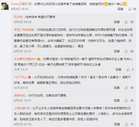 石宇奇在昨天的羽毛球世锦赛男单决赛中0-2不敌日本选手桃田贤斗,无缘冠军。赛前曾有网友在石宇奇微博下面留言“如果你让桃田贤斗在南京拿了世锦赛冠军,我就骂死你 骂你一晚上”。石宇奇比赛结束后回了这位网友“快来快来 希望你不要停”。网友也纷纷站出来指责这位网友“你行你去吧,站着说话不腰疼。”