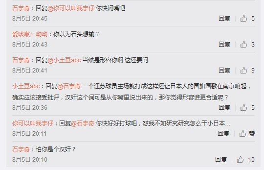 随后还有网友称石宇奇“你话真多,感觉你一天天不训练,光刷微博了”。石宇奇也毫不客气“你个碎嘴”。还有网友提到“看日本的国旗和国歌在南京因为你搞起来,你是不是很爽”。石宇奇怼回去“怕你是个汉奸?”