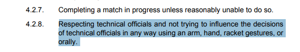 随后,更详细列出17点要求,包括不能迟到、以一种体面、具有体育精神的方式指导自己的行为等。更特别指出:“尊重技术官员,不得以任何方式,比如用胳膊、手、挥动球拍或语言来影响技术官员的决定。”