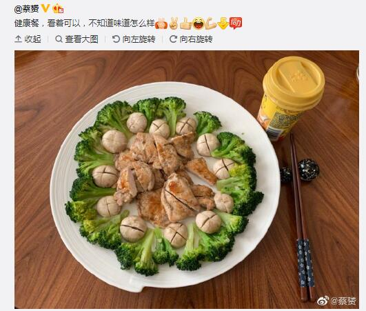 蔡赟在临近中午12点时发出微博,他写道:“健康餐,看着可以,不知道味道怎么样”还配了一连串的小表情,十分可爱,照片中的午餐摆盘一如既往的精致,从内到外依次是鸡胸肉、蘑菇和西兰花,旁边还搭配了一杯酸奶。经常健身的人都知道,这几样是十分健康的健身餐了,对身体十分好,但也十分清淡,很多健身的朋友都是硬着头皮吃,不过让蔡赟这样一摆,顿时也让人增加了一些食欲。