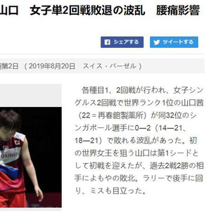 当地时间8月20日,2019年羽毛球世锦赛进入到第二个比赛日的较量。耗时40分钟后,现世界排名第一的日本名将、赛会头号种子选手山口茜(22岁),爆冷以0-2(14-21、18-21)不敌新加坡小将杨佳敏,无缘女单16强。