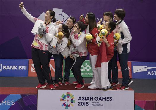 图说:雅加达亚运会上,夺得冠军中国女双组合陈清晨(左四)/贾一凡(左一)在颁奖仪式上合影。