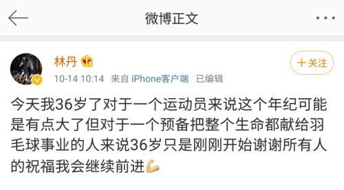 在生日这天,林丹在微博上发文:“今天我36岁了,对于一个运动员来说这个年纪可能是有点大了,但对于一个预备把整个生命都献给羽毛球事业的人来说,36岁只是刚刚开始,谢谢所有人的祝福,我会继续前进。”