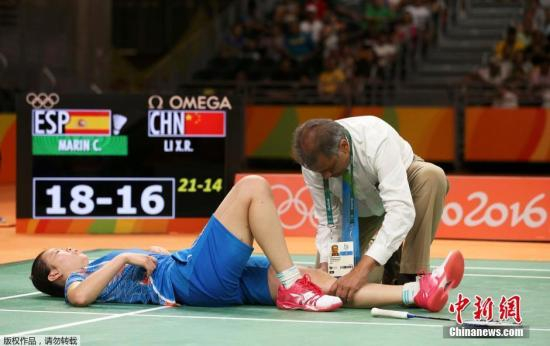 里约奥运会羽毛球女单半决赛,中国选手李雪芮0:2不敌西班牙选手马琳,无缘决赛。在比赛中,李雪芮膝盖遭遇突发伤情,比赛一度暂停。图为李雪芮倒在场内,接受治疗。